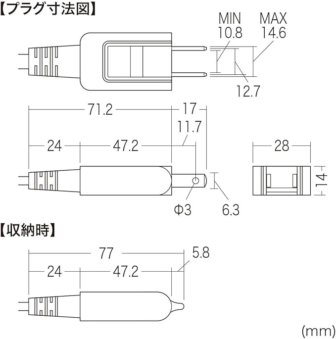 ■プラグ仕様:ACインレット(メガネ型)・2Pオス(絶縁キャップ付きプラグ収納式スイングプラグ)