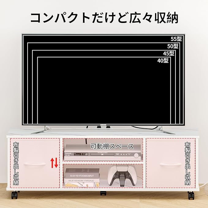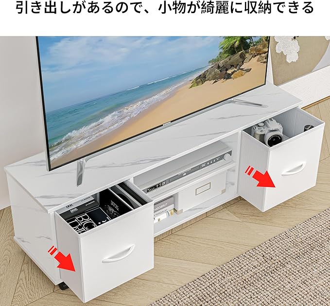 LunarLight テレビ台 幅109.5奥行28.6高さ36.8cm テレビボード ローボード コンセント付き 布製引き出し付き 多機能収納ボックス 収納棚板調整可能 32型 42型 55型テレビ適合 収納 組立簡単 工具不要 耐震転倒防止 耐荷重100kg (大理石調ホワイト)