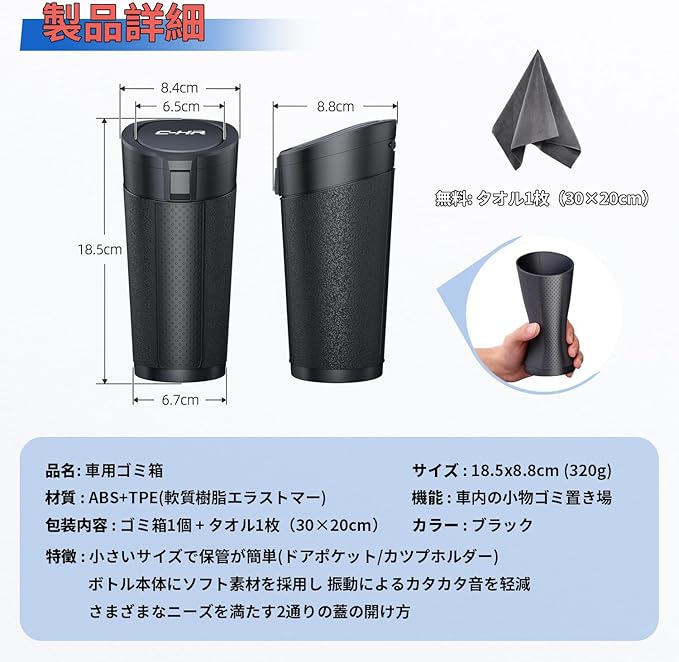 C-HR 車用ゴミ箱 スリム ボトル型 ソフトゴミ箱 蓋を開ける2つの方法、chr カスタム アクセサリー 内装パーツ、小物入れ おしゃれ ゴミ箱 車載 車内便利 カー用品 +洗車タオル1枚 (ブラック, C-HR 専用)
