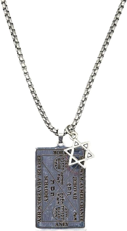 持ち主の金運を大きく上げて金流を改善し豊かな日々を与えるよう祈願した西洋魔術の強力なお守りネックレスです。魔術書「モーセ第七の書」に記された第1の印章の護符の図柄は天から授かった秘術とされます。六芒星はダビデの星とも呼ばれ、邪を退け調和と安定を与えるパワーを放つと言われます。