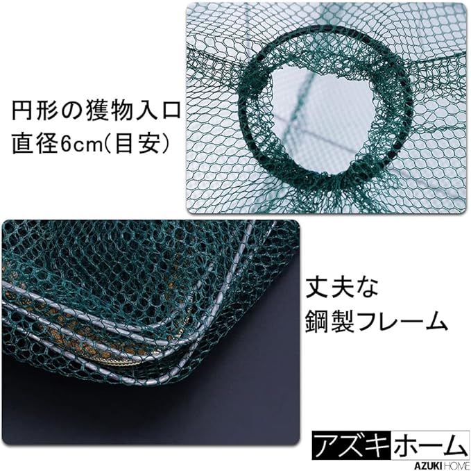 【特徴】エビ・ハゼ・タナゴなど獲物を両サイド2ヶ所の穴から捕獲できます。中央にファスナー付きの餌入れ用袋があります。