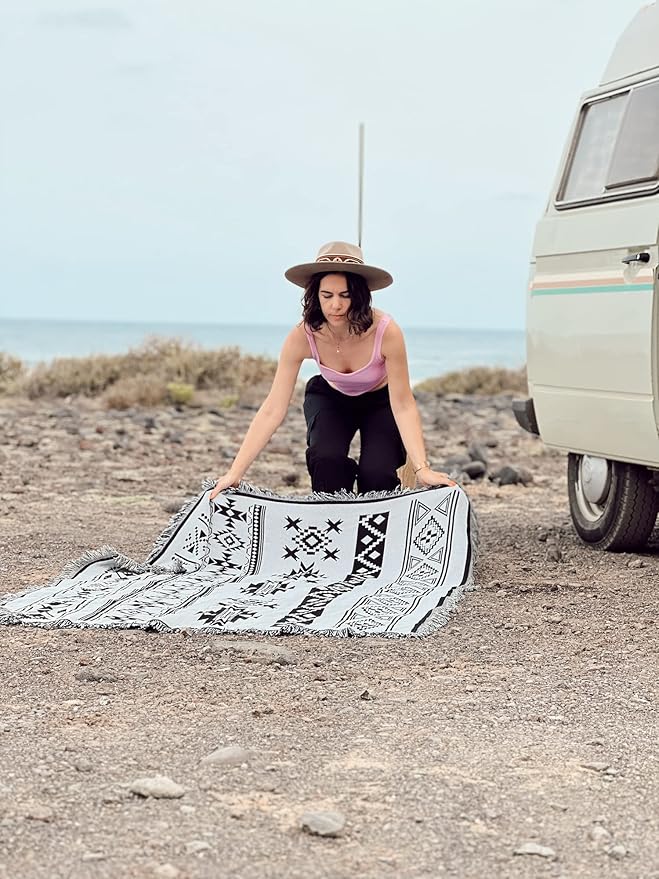 Peel Forest オルテガ メキシカン アメリカン 幾何学模様 ブランケット キャンプ アウトドア タオルブランケット ,ラグ おしゃれ 黒と白 , モロッカン ,西海岸 インテリア,130X160cm ……………