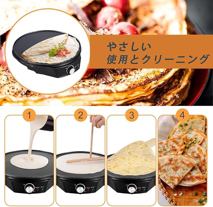 お手入れ簡単:このクレープ製造機は表面が焦げにくいので、お手入れがとても簡単です。湿った布やスポンジで残留物を拭くだけですぐに使用できます。もうこすったり浸したりする必要はありません。