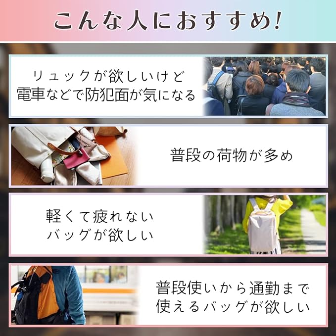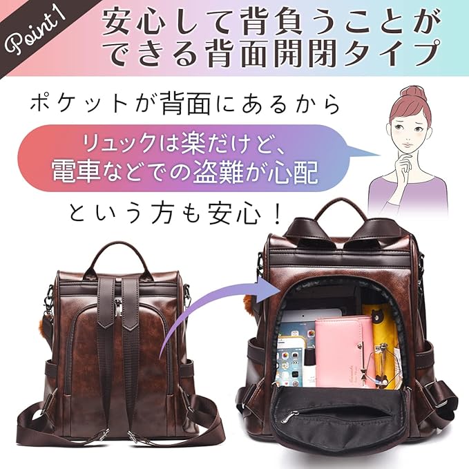 背面から開くタイプで安心、防犯・盗難防止に役立つレザー調のバックパック リュックサックです。