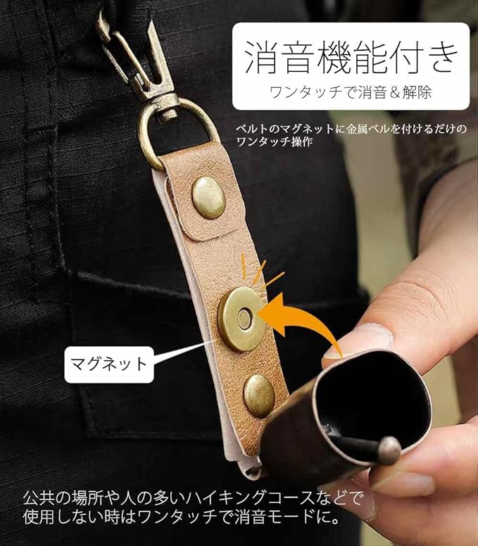 【消音機能付き】便利な消音機能機能付き。公共の場所や人の多いハイキングコースなどで使用しない時にご利用ください。ベルトのマグネットに金属ベルを置くだけのワンタッチ操作です。 簡単にミュートとミュート解除ができます。