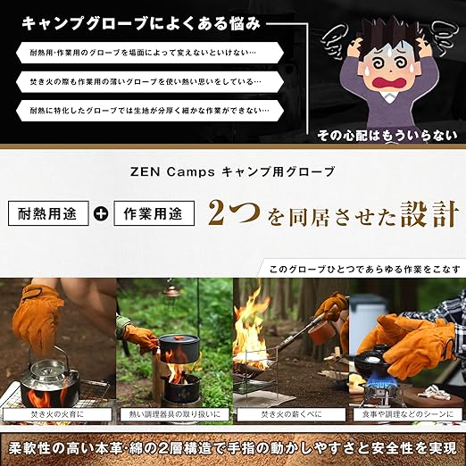 ✅【外側は牛革本革、内側は100%コットン】 焚火台や薪ストーブ、ダッチオーブンなどで使用できるよう、手袋の周りの縫い目を包んで二重縫製にしました。丈夫さがさらに補強されているので、ささくれた木材など素手や軍手では危ないものも難なく持つことができます。