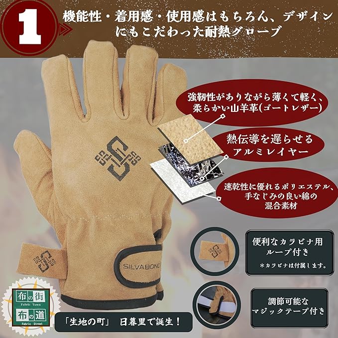 SILVABOND 【山羊革x3層構造x日本耐熱試験2種クリア】 耐熱 手袋 キャンプ グローブ やわらかい 本革 日本耐熱試験2種認定済み 耐熱3層構造 アウトドア 焚き火 BBQ 防寒手袋 ユニセックス カラビナ