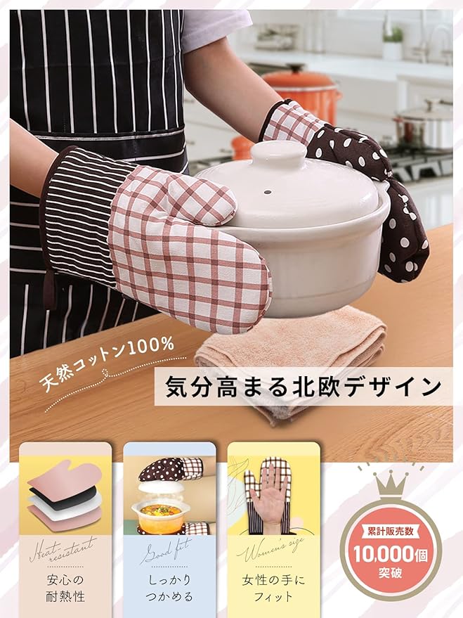 材: コットン ミトンのサイズ:29.5*18.5*3 cm 耐熱温度:260℃ 重量:185g パッケージ内容: 耐熱ミトン *2(ブラウンチェック/ブラウン/ミントブルー/チェリーピンク)