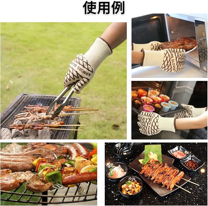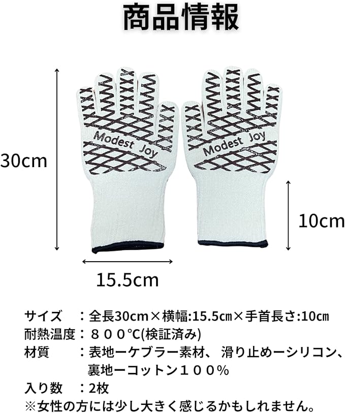【商品情報】サイズ:全長30cm 横幅:15.5㎝ 手首長さ:10㎝ 耐熱温度:800℃(検証済み) 材質:表地ーケブラー素材、 滑り止めーシリコン、 裏地ーコットン100% 入り数:2枚 ※女性の方には少し大きく感じるかもしれません。