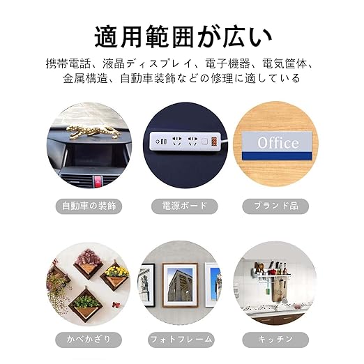 【その他の用途】:1.携帯電話、デジタルパンチタイプで貼り付け、2.電子、電気製品の耐震化に使用!3.アクセサリーに使用する例:毛糸の貼り付け、家具の装飾テープの貼り付け、携帯電話の修理用品、自動車の装飾テープの貼り付けなど。4.自動車に使用する一般的な貼り付け、銘板貼り付け、ワイパー貼り付けなど――5.各種自動車、オートバイの銘板マークアルファベットの貼り付け。6.自動車装飾ストリップ、導水ストリップ、シールストリップ、車内でパネルの接着固定。7.各種電気製品の外殻、金属部品の構造的接着固定など。