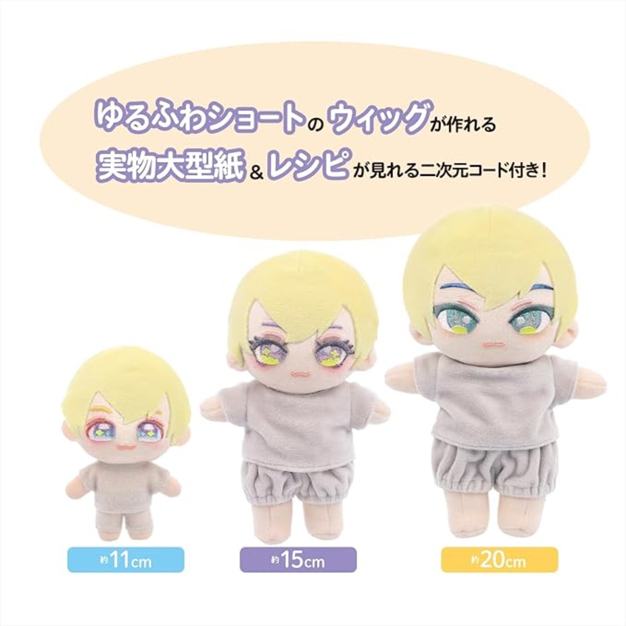 セット内容:ぬいのボディ1体・ゆるふわショートのウィッグが作れる実物型紙・レシピが見えるQRコード