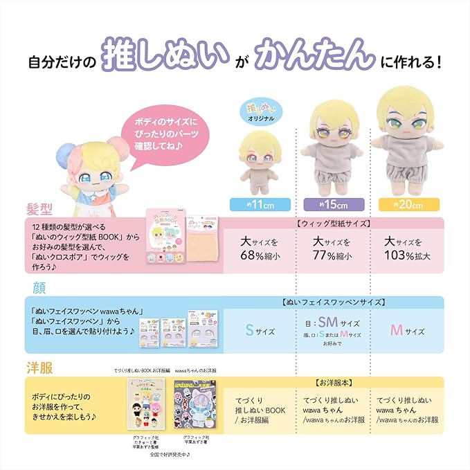 11cmは「てづくり推しぬいBOOK」、15cm・20cmは「てづくろ推しぬいwawaちゃん」のお洋服を作って、きせかえを楽しもう♪