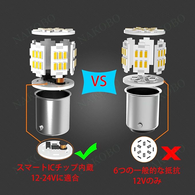 【極性フリー&取付簡単】純正球(S25)とほぼ同じサイズなので、極性フリーで、取付は簡単!原箇所のまま差し込むだけで取付ます。適用ソケット:ターンシグナル、逆光、ブレーキライト。適用ソケット:S25 P21W 1156 BA15S G18。