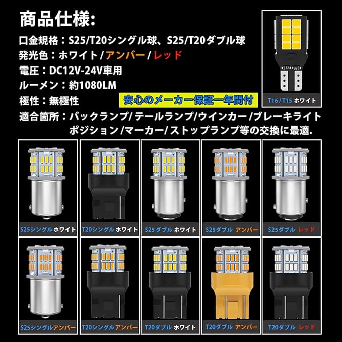 【形状】S25_180 ダブル(1157 BAY15D P21/5W)兼用、12V車専用,1080LM/2個 54LED 3014SMD アンバー 。ブレーキランプとして使用する時、効率は1.32Wです。
