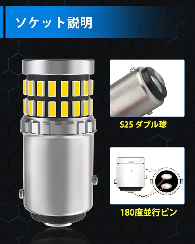 【型番】 S25ダブル球LED ホワイト (BAY15D/ P21/5W 180度平行ピン)、 3014チップ搭載、 消費電力:2.76 、動作電圧:DC12V-24V、動作電流: 0.2-0.25mA、色温度:6000K-6500K、 動作温度環境:-35℃~+75℃ 、 材質: 航空アルミ 、パッケージ内容:2個入り