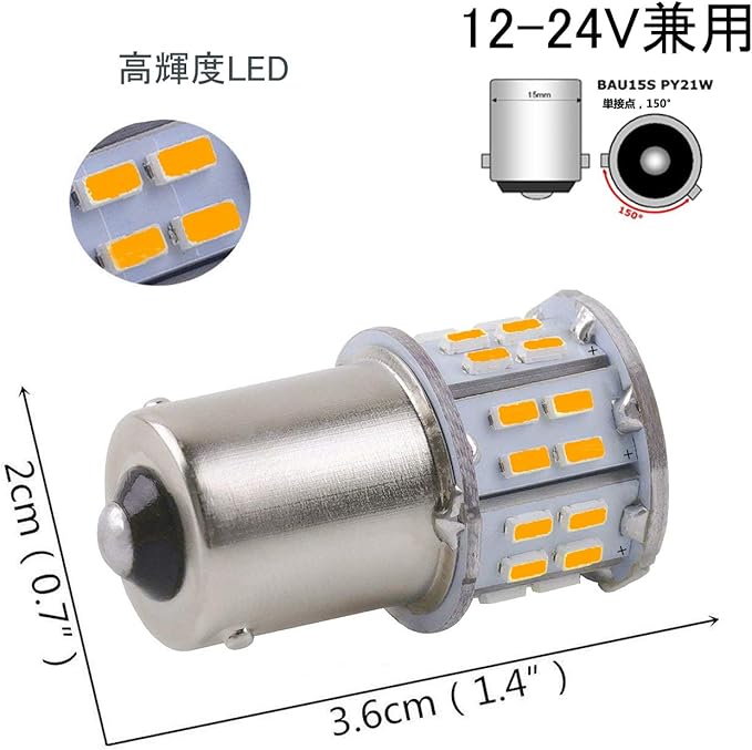 製品情報:S25 LED ウィンカーランプ、S25シングル 150度ピン BAU15S、発光色:イエロー/アンバー/オレンジ 、12Vと24V車兼用、24Vトラックにも対応、50連SMDチップ 搭載、無極性、取付簡単、1年保証、2個入り。ご注意:ウィンカー球に使用する場合、車種によって、ハイフラ(高速点滅)現象が出る場合がございます、この場合、別途に抵抗器を追加必要があります。予めご了承ください。