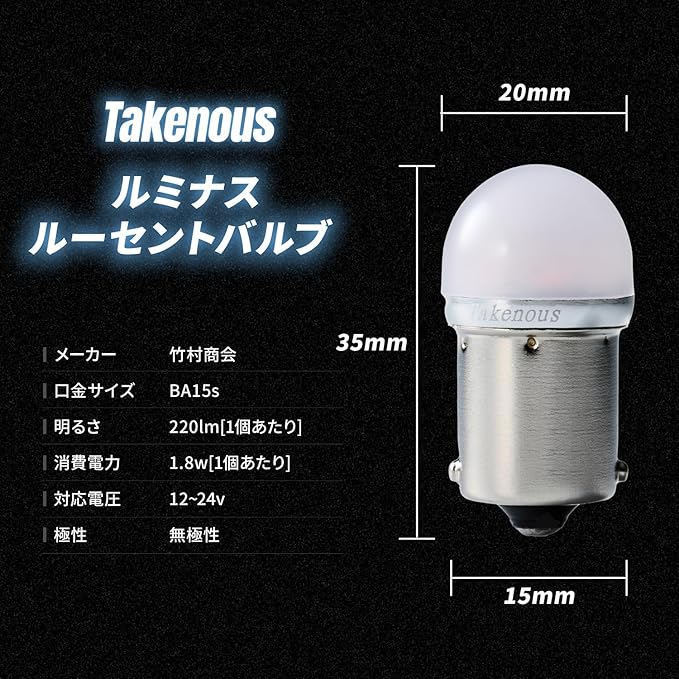 Takenous 竹村商会 S25 LED シングル ホワイト BA15s ルミナスルーセントバルブ バスマーカー用 トラック用品 2個セット(ホワイト)