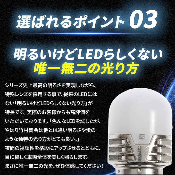 ✅【明るいけどLEDらしくない唯一無二の光り方】 シリーズ史上最高の明るさを実現しながら、特殊レンズを採用する事で、 従来のLEDにはない「明るいけどLEDらしくない光り方」が特長です。 実際のお客様からも高評価をいただいております。 「色んなLEDを試したが、やはり竹村商会は他とは違い明るさや蛍のような独特の光り方がとても良い。」 夜間の視認性を格段にアップさせるとともに、目に優しく車両全体を美しく照らします。 まさに唯一無二の光を、ぜひ体感してください!