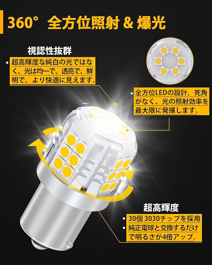 【超高輝度&長寿命】超高輝度1200LMの明るさ低電力消耗、最先端超高発光効率の3030LED素子30個搭載、360 全方位照射でき、12V車用S25 シングル バルブ。原装ランプより4倍に明るいです. 6000K-6500K純白の光です. 省エネ、しかないです. 長持ちで、運行時間は50000時間以上です. 起動時、遅延の状況がないです。