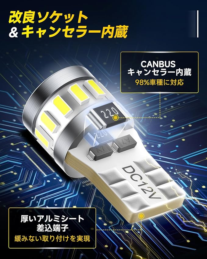 【高輝度t10 led】このT10 ledは高発光効率の3014SMD 高輝度チップを採用し、純正ハロゲンと比較して、最大で約5倍の明るさUPが可能になって、極の明るさが実現します。1個300LMの圧倒的な明るさを実現する、高性能のLEDチップを使用しています。純正ホワイトの発光していて、すみずみまで均一な光を照射し、発光角度も360 全方位照射でき、暗いエリアがありません。