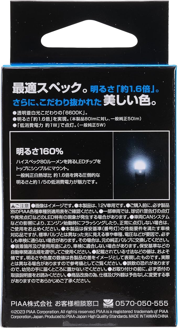 PIAA(ピア) ライセンスプレート用バルブ LED 6600K 蒼白光 12V 1.0W 80lm T10 2年保証 ハイブリット車/電気自動車対応 車検対応 1個入 LEL107