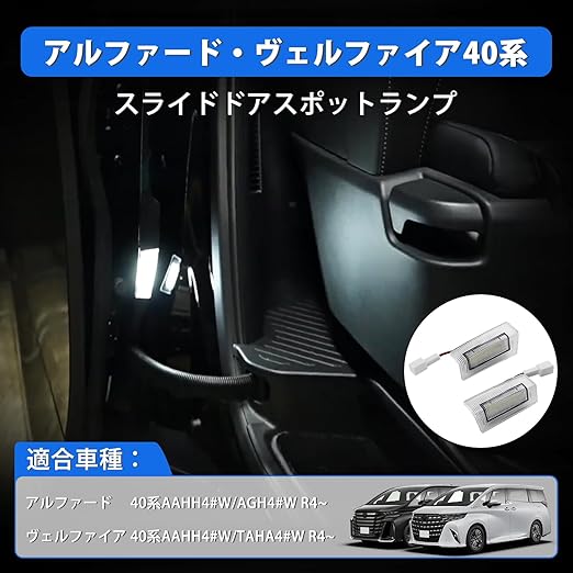 適用車種:トヨタ アルファード ALPHARD 40系;型式:AGH4#W/AAHH4#W;R4~。トヨタ ヴェルファイア VELLFIRE 40系;型式:TAHA4#W/AAHH4#WR4~。セット内容:カーテシランプ 2p、取付工具 1p。