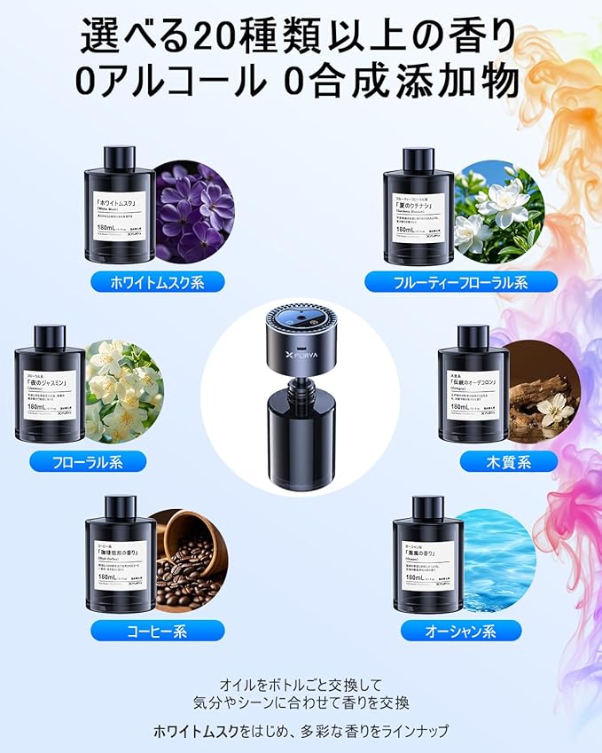【2025新登場・180mL で 16 ヶ月持続】FLIRVA 車 アロマディフューザー 超音波霧化【静音 自動ON/OFF 8 色雰囲気ライト 内蔵バッテリー】ホワイトムスクの香り フランス産天然香料 F26 Plus 車 芳香剤 車 消臭 Car Fragrance