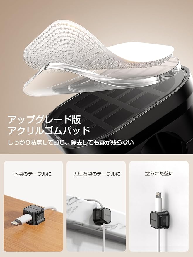 【ミニサイズ、コンパクト!】0.87 インチのコード クランプの最小幅により、最も狭いスペースでもしっかりと固定できます。Joyroomのケーブルクリップは、貼り付け面積をあまり取らないので、どんな場所でも完璧に隠すことができます。ご注意❗:貼り付ける前に表面のほこりを取り除き、粘着テープの粘着力を高めるために30秒間押し続けてください。 より効果的に使用するには、12 ~ 24 時間待つことを強くお勧めします。