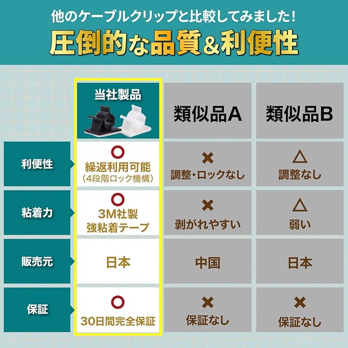 【繰り返し使える!4段階ロック機構】 4段階のロック機構でケーブルに合わせて固定することができます!ロックした後もワンタッチでロック解除ができるので繰り返し使えます。ガジェットが増えた際などのケーブルの増減に対応することができます。ロックも解除も押し込むだけなので狭い場所での取り付けも簡単です!
