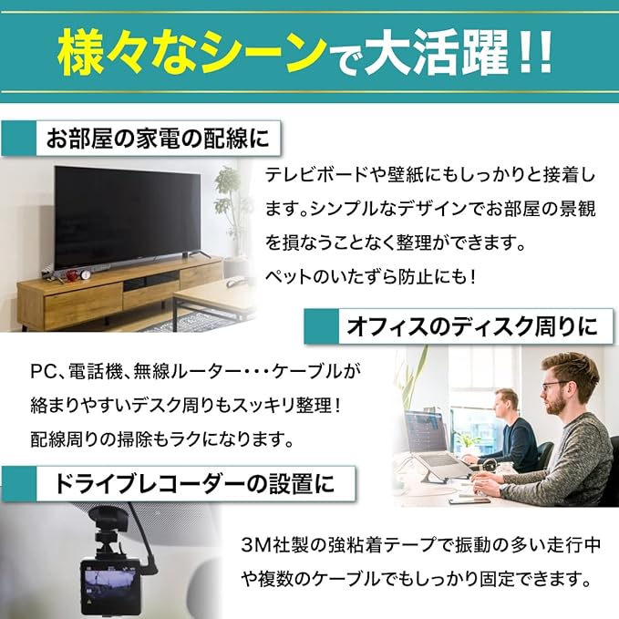 【ここが違う!新採用の3M社製テープ】ご要望にお答えして粘着テープを3M社製のテープを新規独自採用し従来品から改良しました!TV、PC、デスクなどの配線をまとめることはもちろん、壁やデスクの裏などに固定して這わせたりと自由自在にケーブルを整理が可能となります!