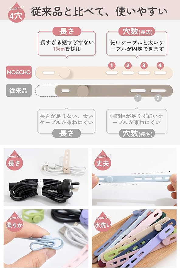 【4穴調整・束ねやすい】ケーブルクリップは4穴のデザインを採用し、穴径を調整することで、 太いコードも細いコードもしっかりと固定できます