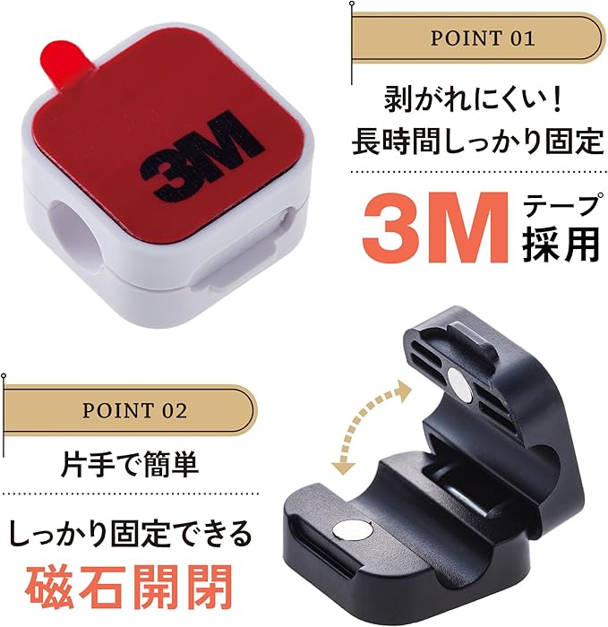 【工具不要で手軽に設置】 煩わしい工具や複雑な手順は一切不要です。片手でも簡単に取り付けられるので、誰でもすぐにケーブルの整理整頓ができます。 設置後は、マグネットの開閉機能でケーブルの追加や取り外しもスムーズです。忙しい方にも最適な便利アイテムです。