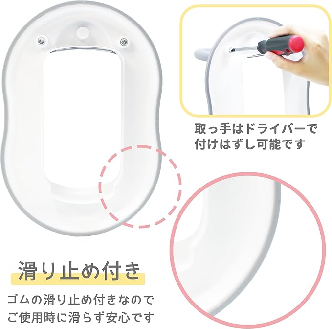 【材質】ポリプロピレン:本体・取っ手・便座 / TPE:便座のフチのゴム部分 / スチール:ネジ