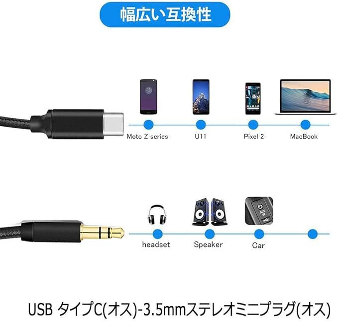 幅広い互換性 USB C - 3.5mm 車用 AUXコードは多くのUSB C端子のある設備に対応します。