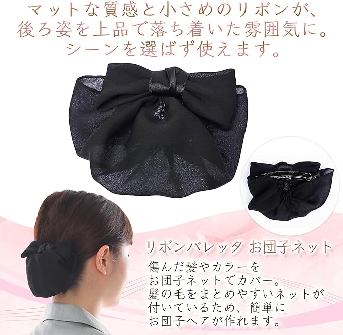 [美人髪KOEIDO] リボン バレッタ(ネットつき)お団子ネット シニヨン シュシュ 簡単 (ブラック) (ブラック(マットな質感/小さめリボン))