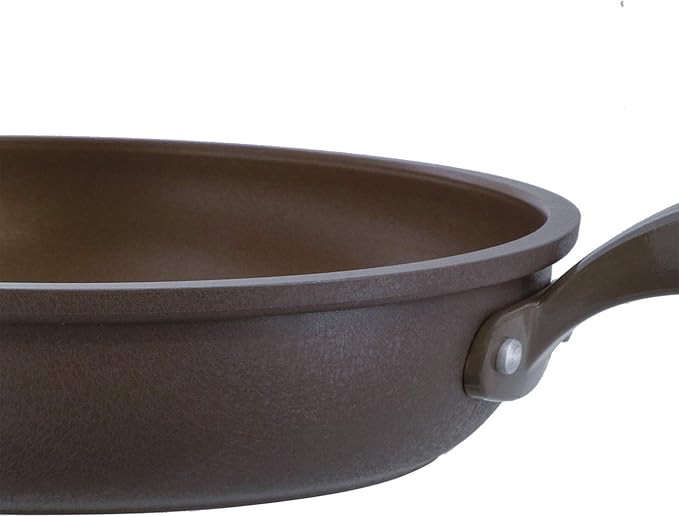 素材:本体/アルミニウム合金 オリジナル縁巻き深型形状、(エッグパンは除く)、内面/ダイキンEKダイヤモンドコートブラウンカラー(耐摩耗性試験30万回)、外面/耐熱焼付塗装、底面/ステンレス(SUS430) 0.4mm圧着、ハンドル/フェノール樹脂