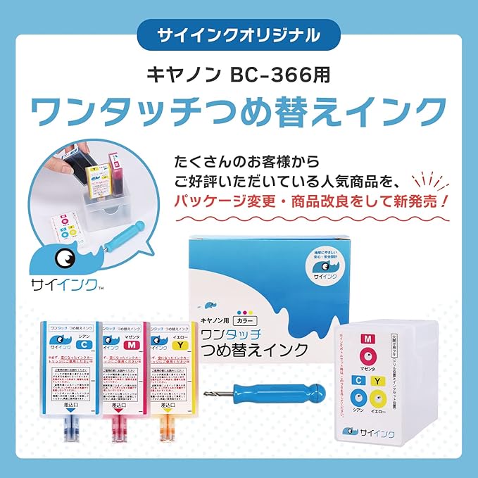 【サイインク】《1本あたりの容量:純正の約2.6倍!》キヤノン(Canon)用 ワンタッチ詰め替えインク FINEカートリッジ BC-366 カラー3色 対応 補充用インク シアン 2本 マゼンタ 2本 イエロー 2本 対応機種: PIXUS TS3530 / PIXUS TS3730 商品コード:4991C001 4990C001