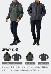 【3WAY仕様】プロテクター内蔵のアウターと保温力をもつインナージャケットの二重構造で、気温やシーンに合わせた組み合わせが可能。