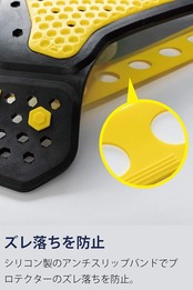 軽量ながらCE規格 Lv.2をクリアする安全性能。厚さ13.5mmの薄型設計。肌側には高い通気性を確保するヘリンクス構造を採用。レザースーツのフィット感に応じて調整可能なアンチスリップバンドを採用。