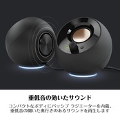 【ホワイトケーブル2本接続タイプ:USBから電源 & アナログケーブルで音声を入力】人気のUSB電源スピーカー「Creative Pebble」と同様に、パーソナル リスニングに適したサウンド ステージを実現するアナログ接続タイプのアクティブ スピーカー。スピーカー ボディ下部にはRGB ライティングを搭載しており、7つの発光パターンでデスクトップをライトアップすることが可能、ムードや好みに合わせてライティング パターンを選択可能