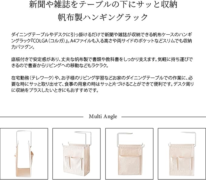 ダイニングテーブルやデスクに引っ掛けるだけで新聞や雑誌が収納できる帆布ケースのハンギングラック