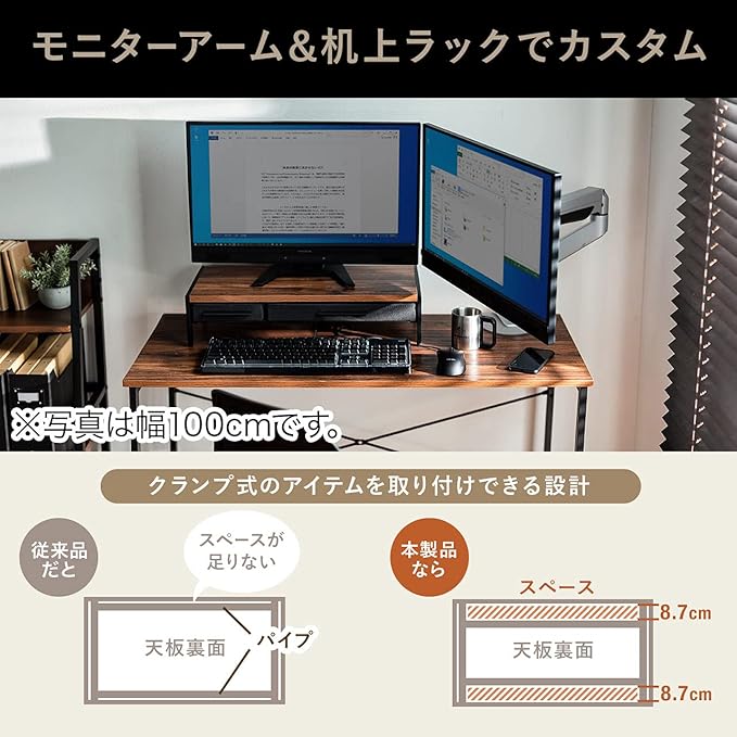 ●補強プレート(CR-LAPLT1)を使用すれば、クランプ式のモニタアームを取り付ける事が出来ます。