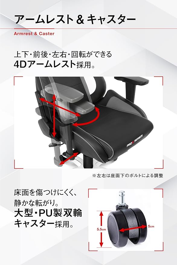 材質:PUレザー(張地)、モールドウレタン(クッション)、スチール(フレーム)、PU(ホイール)