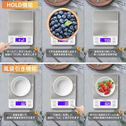 「高精度0.1g、大計量0.5g~5kg、多機能」高品質の圧力センサーを使用し、測量結果が精確で安定です。多機能:風袋引き、単位切替、保持機能、地域設定、自動オン・オフ、較正機能など。クッキング、料理、ペットなど動物用餌の調合、封筒などに幅広く使われているデジタルスケールです。