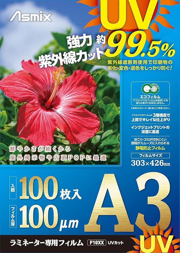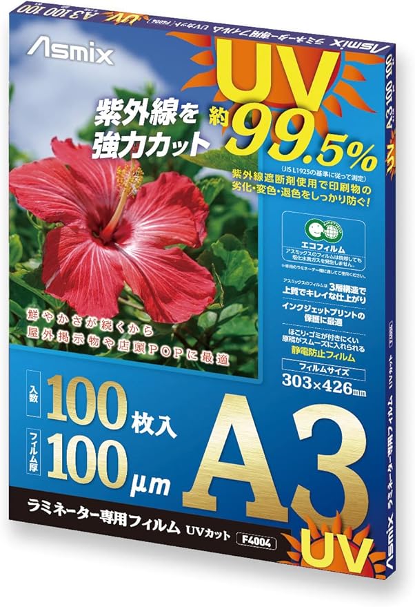 アスカ ラミネートフィルム UV 99.5%カット A3 100ミクロン 100枚入 F4004