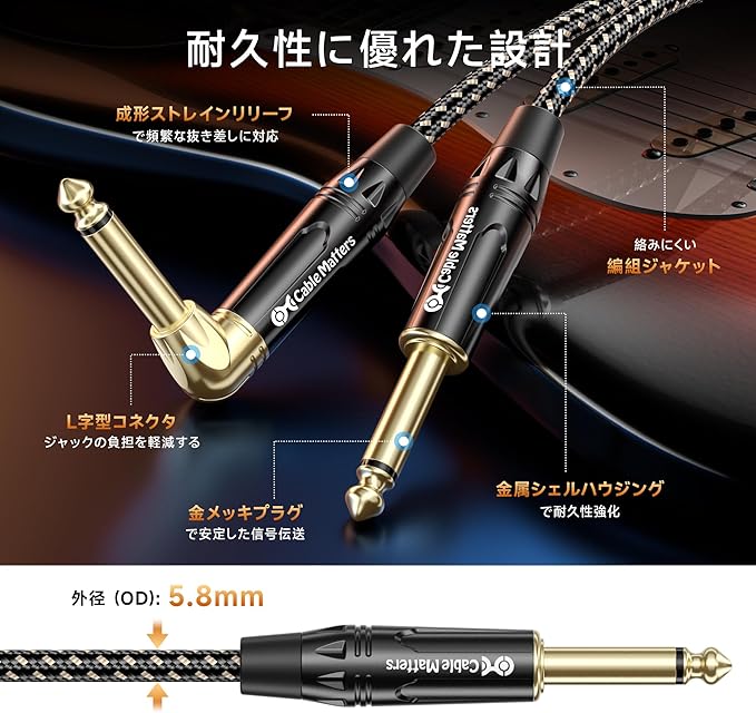 【優れた耐久性】シールド ギターはPVC外層被覆と高耐久編組ナイロン素材を使って、柔軟性と耐久性に優れ、ニック、切り傷、ねじれから保護でき、ケーブルの摩耗や断線、ねじれを防ぎます。ベース シールドが金メッキプラグを採用、ギター ケーブルの性能が高まり、エラーフリーのデータ転送も実現し、長期使用でも酸化等による接触不良、信号劣化の心配がなく、安全な接続を提供します。
