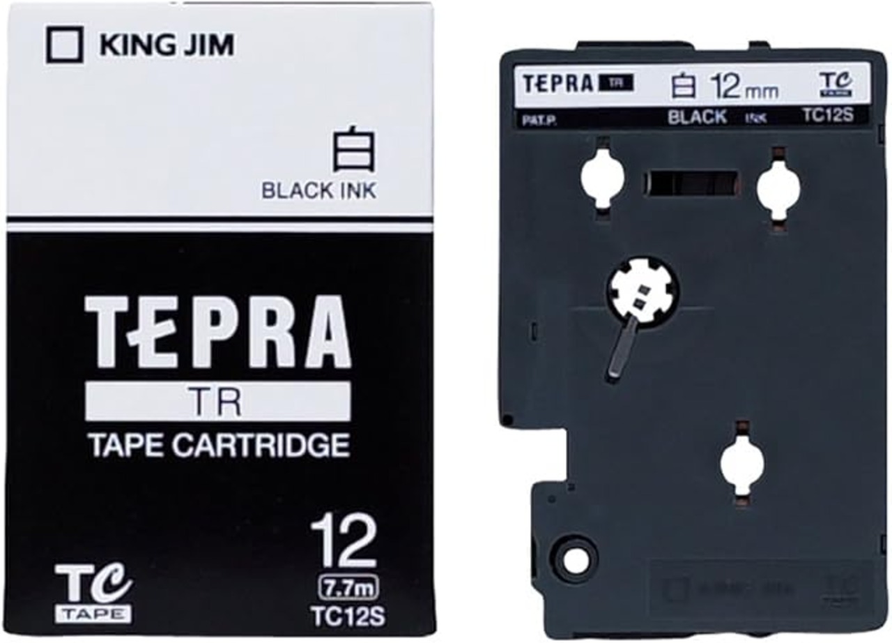 「テプラ」TRシリーズ専用テープ。12mm幅でファイルの背見出しなどに適している。白地に黒文字で印字。
