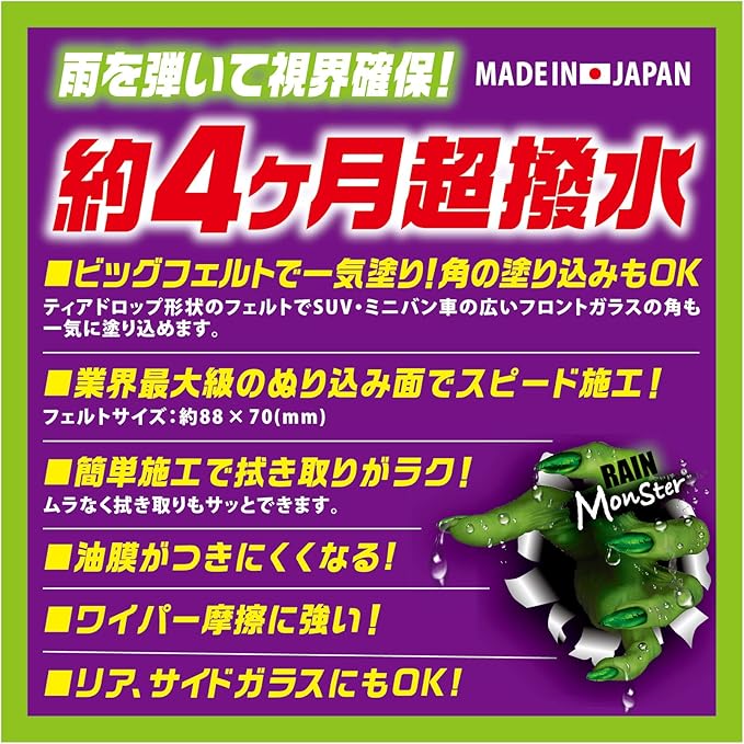 驚異の超撥水! 窓ガラス専用撥水コーティング 窓ガラス専用塗り込みタイプの撥水コーティング剤です シリコーンとフッ素化合物を組み合わせたハイブリッド処方により約4ヶ月持続 フェルトサイズ:約88 70(mm) ※業界最大級(発売時) ワイパー摩擦に強い! リア・サイドガラスにも最適