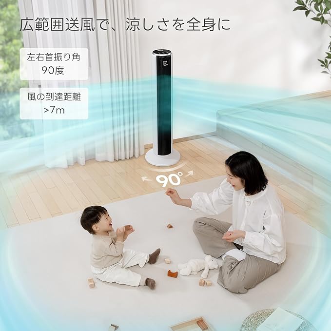 【5段階風量調節・自動調整】風量は1-5段階のきめ細やかに調節可能。室温の変化に応じて心地よい風量に自動調整する「温度センサー」を搭載しています。風速は最大7.5m/sのパワフル送風が可能で、左右90 の首振り機能により、お部屋全体に風を届けます。