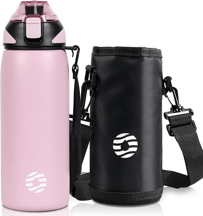 FJbottle 水筒 600ml 真空断熱 マグボトル (ストラップ付き) ワンタッチ 保温 保冷 洗いやすい 広口 ステンレスボトル 水筒カバー 洗浄用スポンジ付き 女の子 男の子 おしゃれ 大人 子供 ピンク